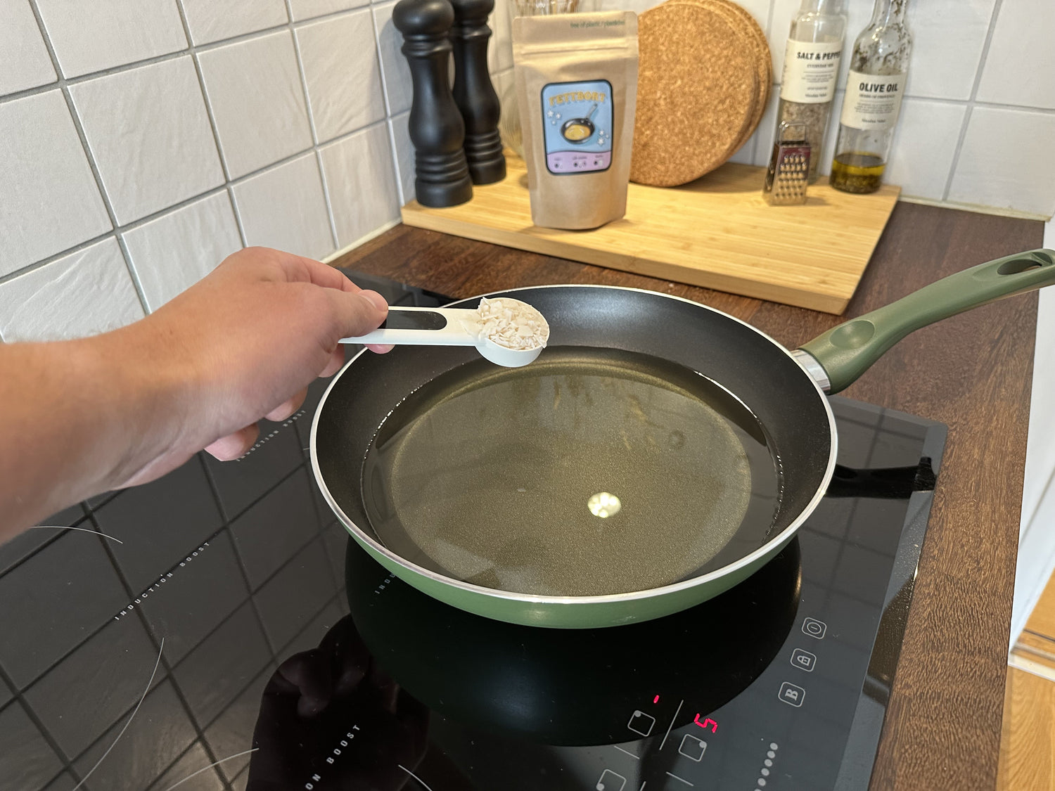 Häll i medan oljan är varm så att produkten löser upp sig och rör om så det fördelar sig jämt. 1 msk Fettbort per 5 dl olja är ett riktmärke.